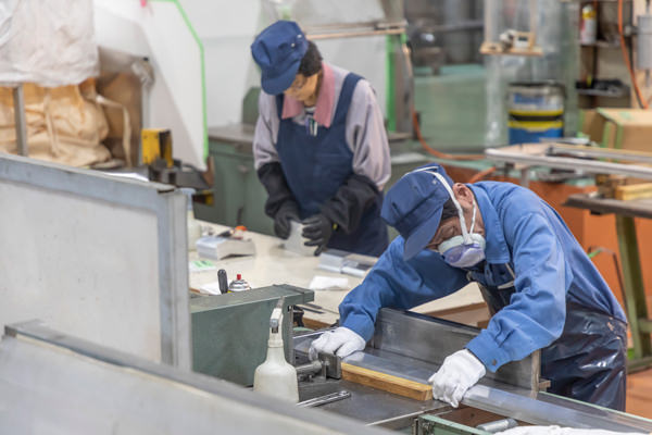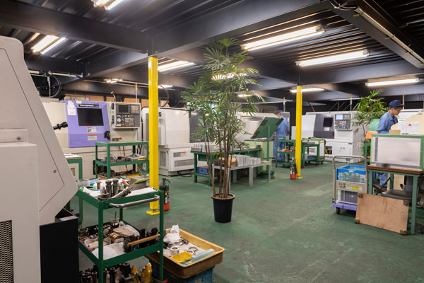 本工場は1967年に設立した創業工場で、当社のものづくりの原点になる工場です。現在は主に量産品の加工(アルミ押し出し品の切断、プレス加工、切削加工)とNC旋盤による機械加工を行っています。また、この工場には物作りの試作耺場があり、高度技能保有者によるアルミ製の社や鳥居、珍しいものでは、壇ノ浦戦い使った伝馬船なども原寸大で作っています。
